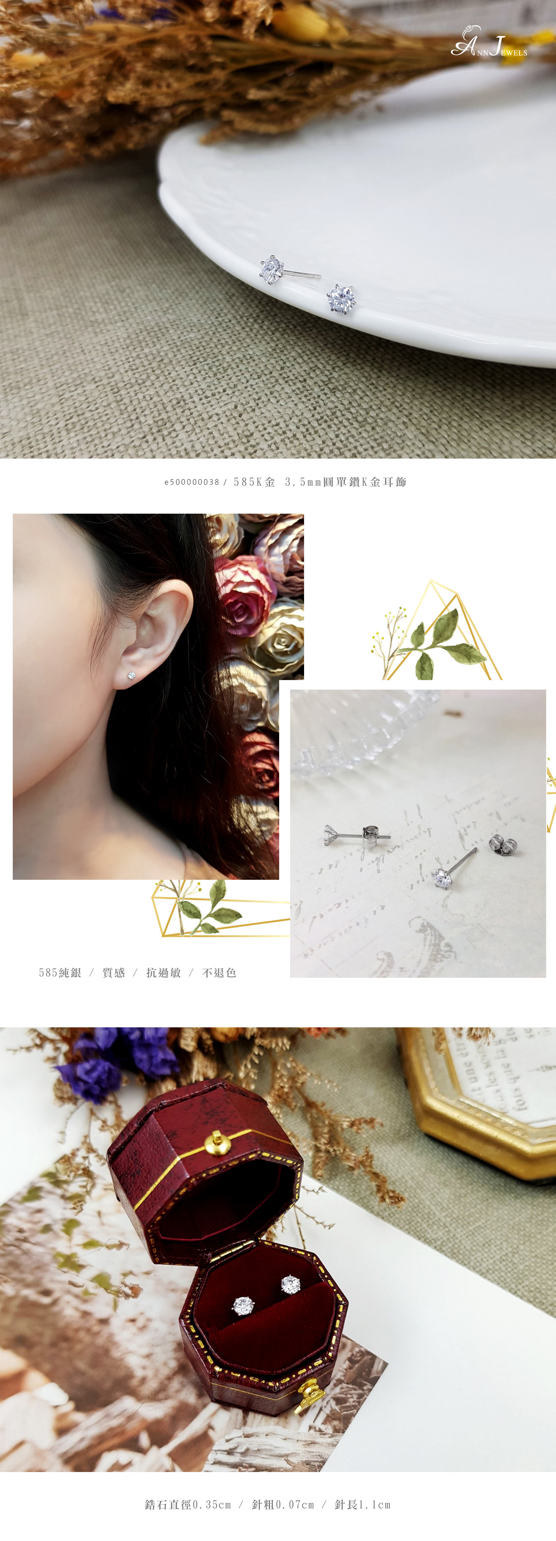| 585K金 | 鋯石直徑0.35cm 針粗0.07cm 針長1.1cm | 耳環一對 |