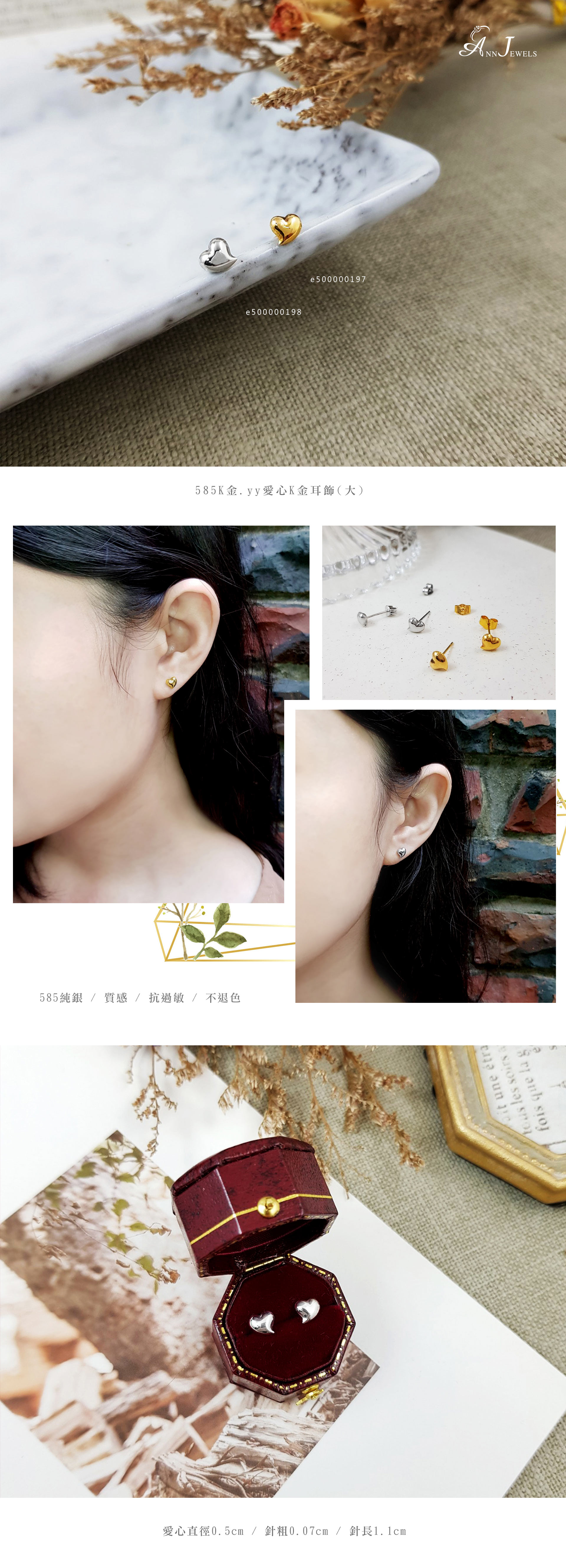 | 585K金 | 愛心直徑0.5cm 針粗0.07cm 針長1.1cm | 耳環一對 |