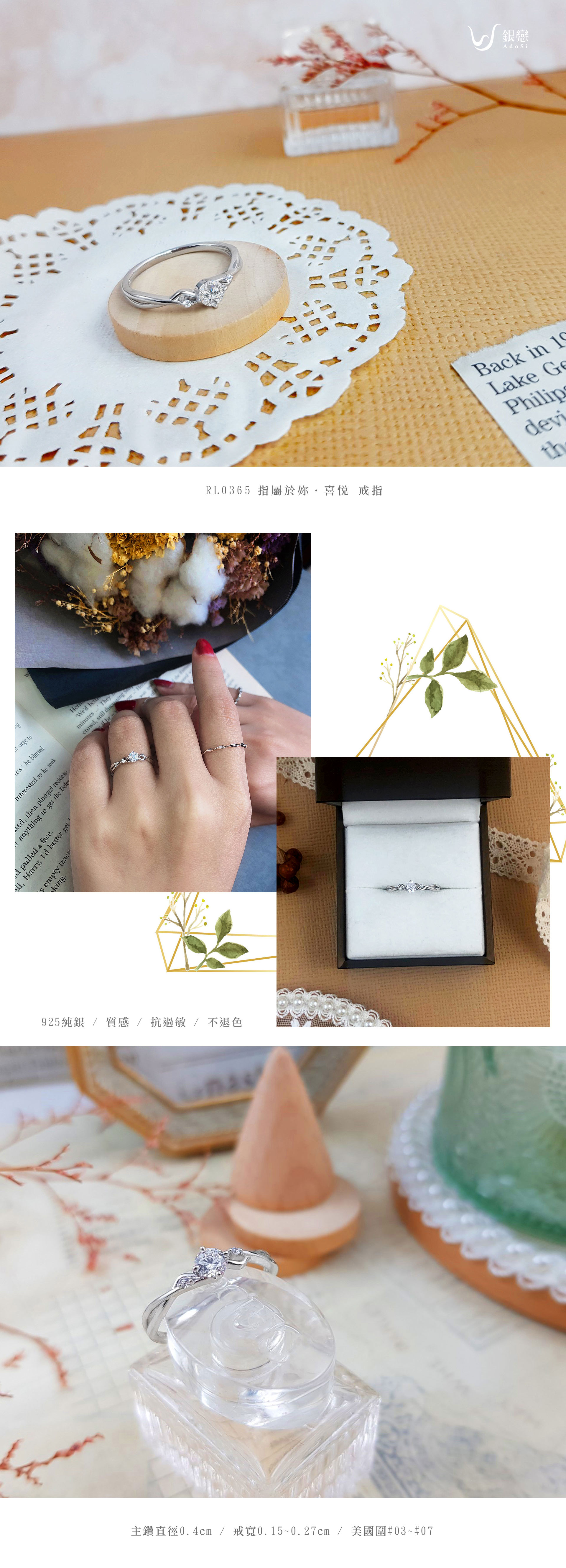| 925純銀 | 主鑽直徑0.4cm 戒寬0.15~0.27cm 美國圍#03~#07 | 戒指1個 |