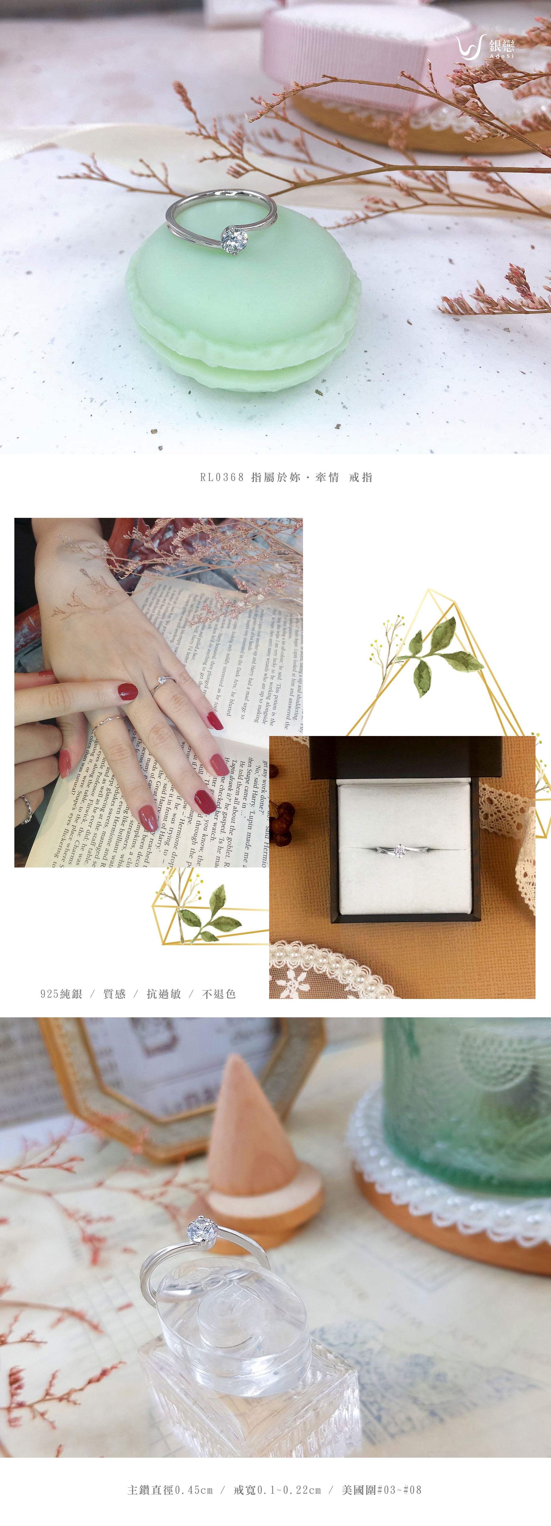| 925純銀 | 主鑽直徑0.45cm 戒寬0.1~0.22cm 美國圍#03~#08 | 戒指1個 |