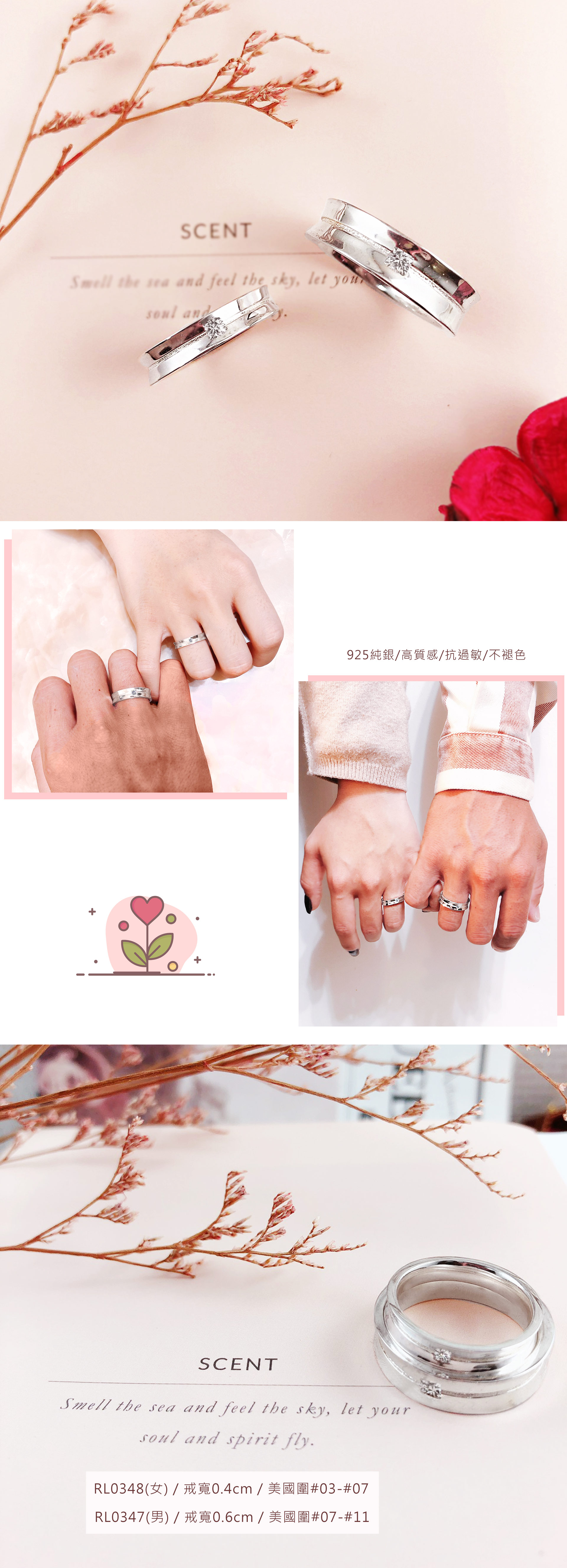 | 925純銀 | 女款戒寬0.4cm,男款戒寬0.6cm 女款美國圍#03~#07,男款美國圍#06~#10 | 戒指1個 |