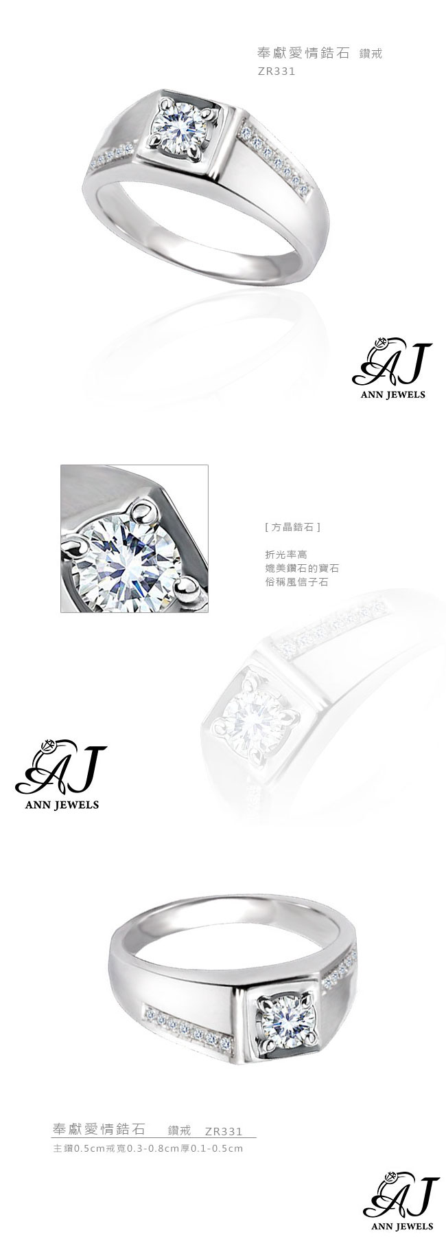 | 925純銀 | 主鑽0.5cm 戒寬0.3-0.8cm 厚0.1-0.5cm | 戒指1個 |