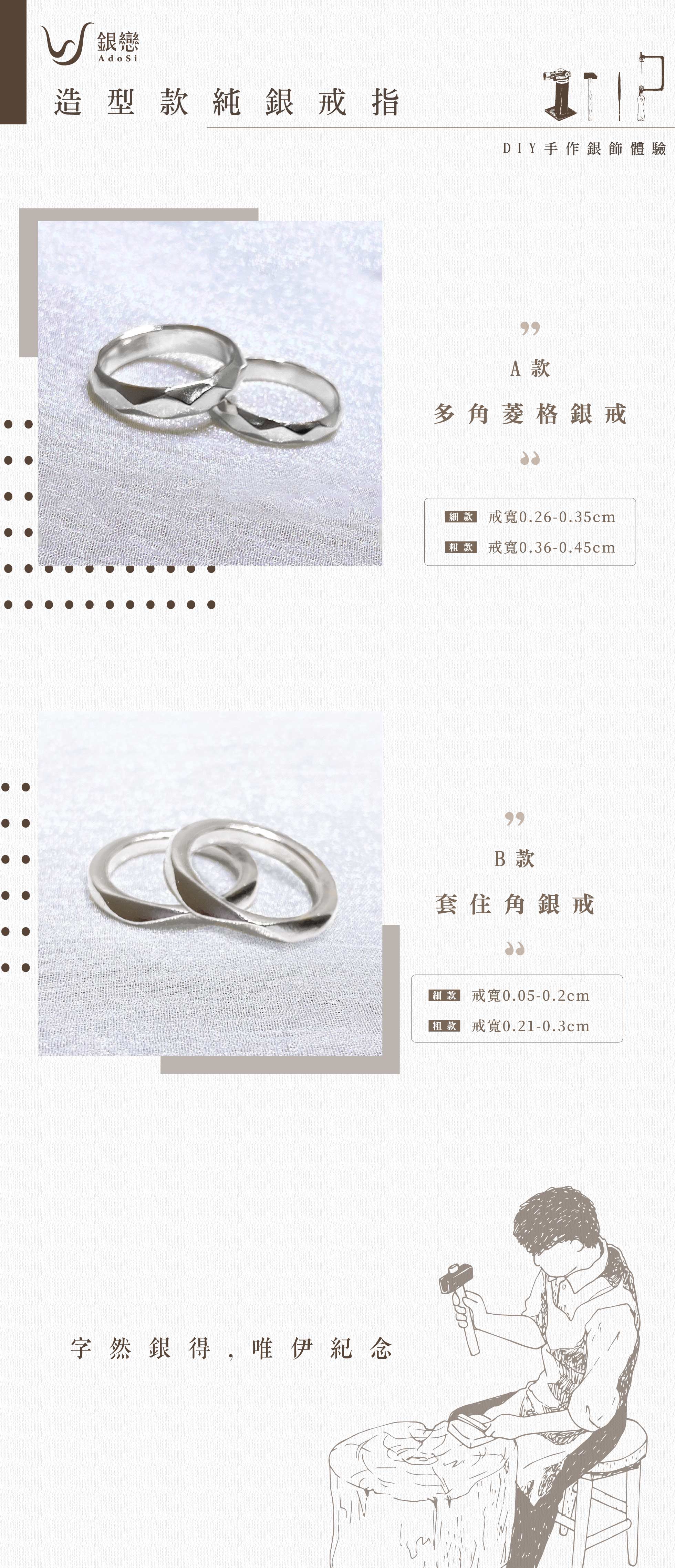 | 全新手作925純銀金工創作體驗,悠然的創作自己 就像製作一枚銀戒指,是一種約定、預約未來的幸福 把記憶的點滴刻印在戒指上,紀念您的唯一 每敲一下就顯得深刻,不論是圖騰、數字還是英文都添入滿滿的祝福 蘊含創作的意義與紀念的價值,是一個體驗金工技藝的創作空間 邀請您一起來為生活增添繽紛的色彩, 加乘美好體驗,創造無可取代的作品 享一年保固,永久免費清潔保養