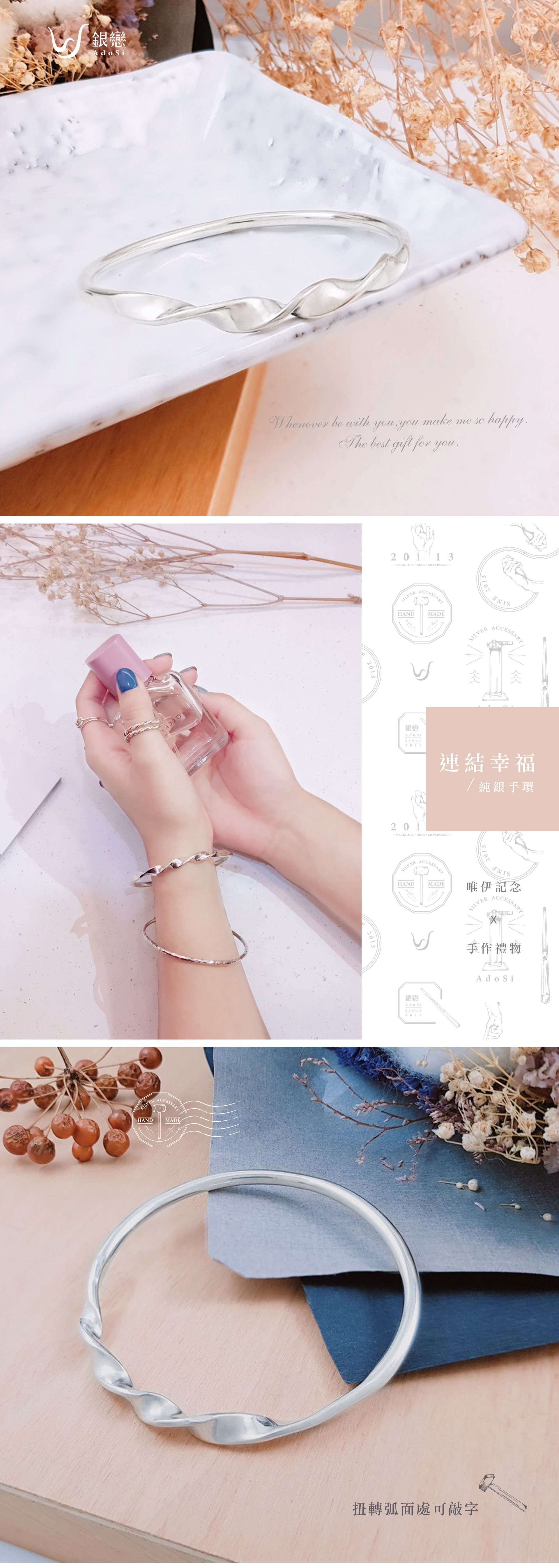 | 925純銀 | 細款寬0.31~0.35cm 粗款寬0.41~0.45cm 完成時間:約2小時 (以文具尺測量,些微誤差±0.5cm為正常值) 保養方式-以拭銀布擦拭即可 備註 ※因需事先為您準備手作材料及用具 下單後,客服將以電話與您確認日期及時段 客服專線(06)-2213806 | 手環1個 |