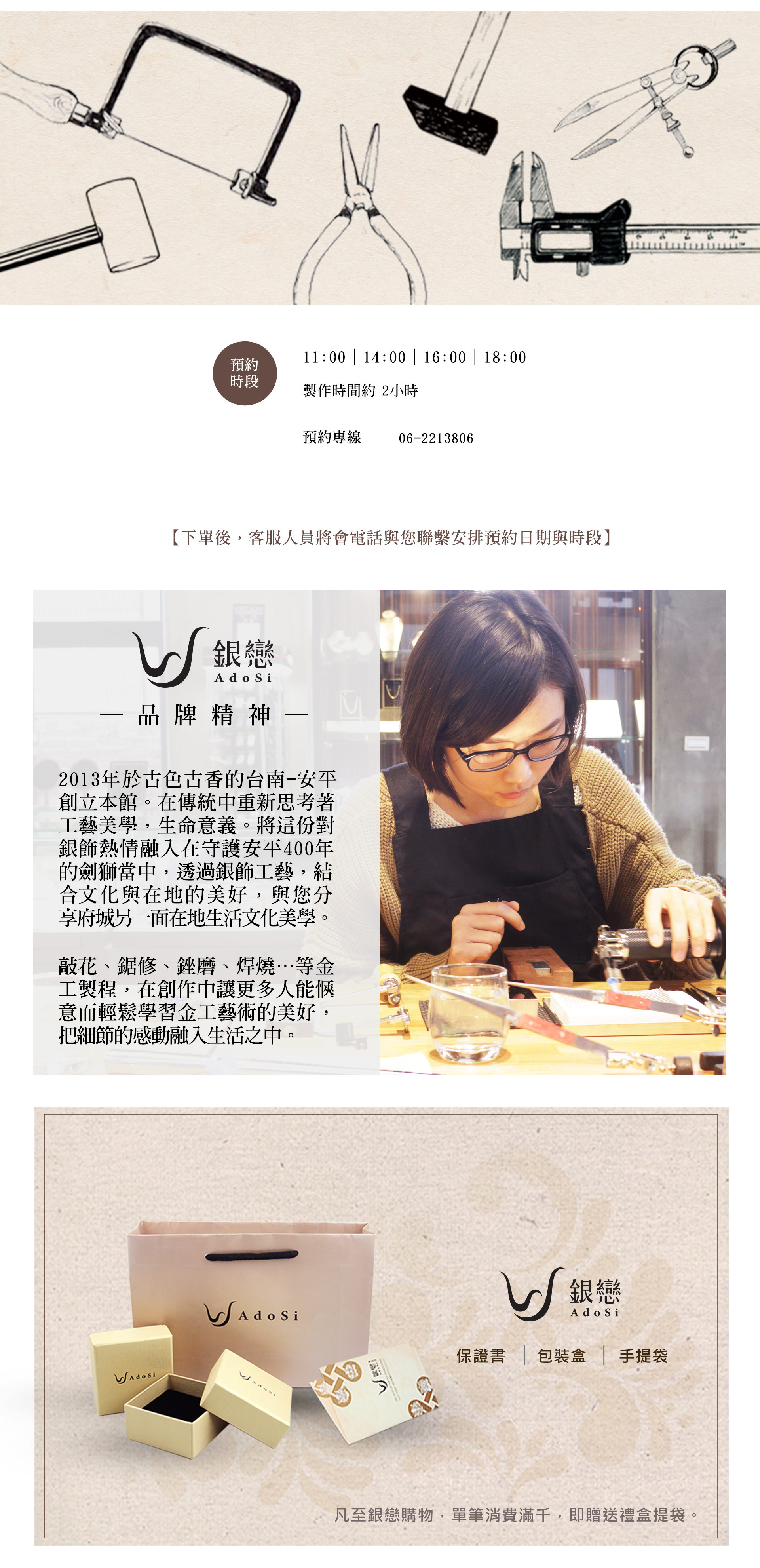 | 全新手作925純銀金工創作體驗,悠然的創作自己 就像製作一枚銀戒指,是一種約定、預約未來的幸福 把記憶的點滴刻印在戒指上,紀念您的唯一 每敲一下就顯得深刻,不論是圖騰、數字還是英文都添入滿滿的祝福 蘊含創作的意義與紀念的價值,是一個體驗金工技藝的創作空間 邀請您一起來為生活增添繽紛的色彩, 加乘美好體驗,創造無可取代的作品 享一年保固,永久免費清潔保養 上課地點 台南-誠品生活│ 台南市南區中華西路一段76號2樓 台南-三井OUTLET│ 台南市歸仁區歸仁大道101號3樓(星巴克正前方)