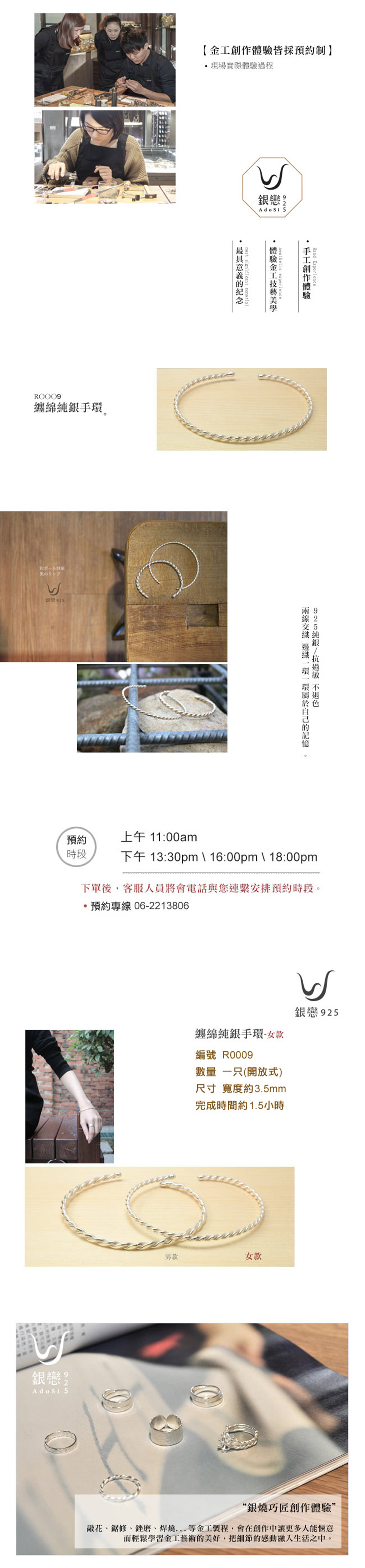 | 925純銀 | 尺寸:寬度1.8mm 完成時間:約1.5小時 | 手環1個 |