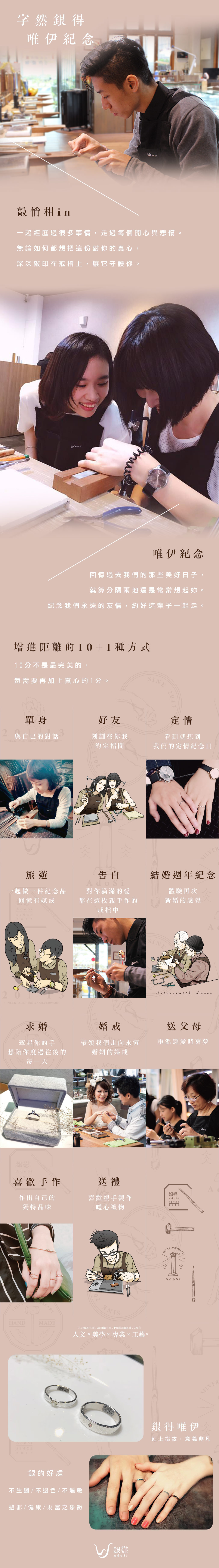 | 全新手作925純銀金工創作體驗,悠然的創作自己 就像製作一枚銀戒指,是一種約定、預約未來的幸福 把記憶的點滴刻印在戒指上,紀念您的唯一 每敲一下就顯得深刻,不論是圖騰、數字還是英文都添入滿滿的祝福 蘊含創作的意義與紀念的價值,是一個體驗金工技藝的創作空間 邀請您一起來為生活增添繽紛的色彩, 加乘美好體驗,創造無可取代的作品 享一年保固,永久免費清潔保養