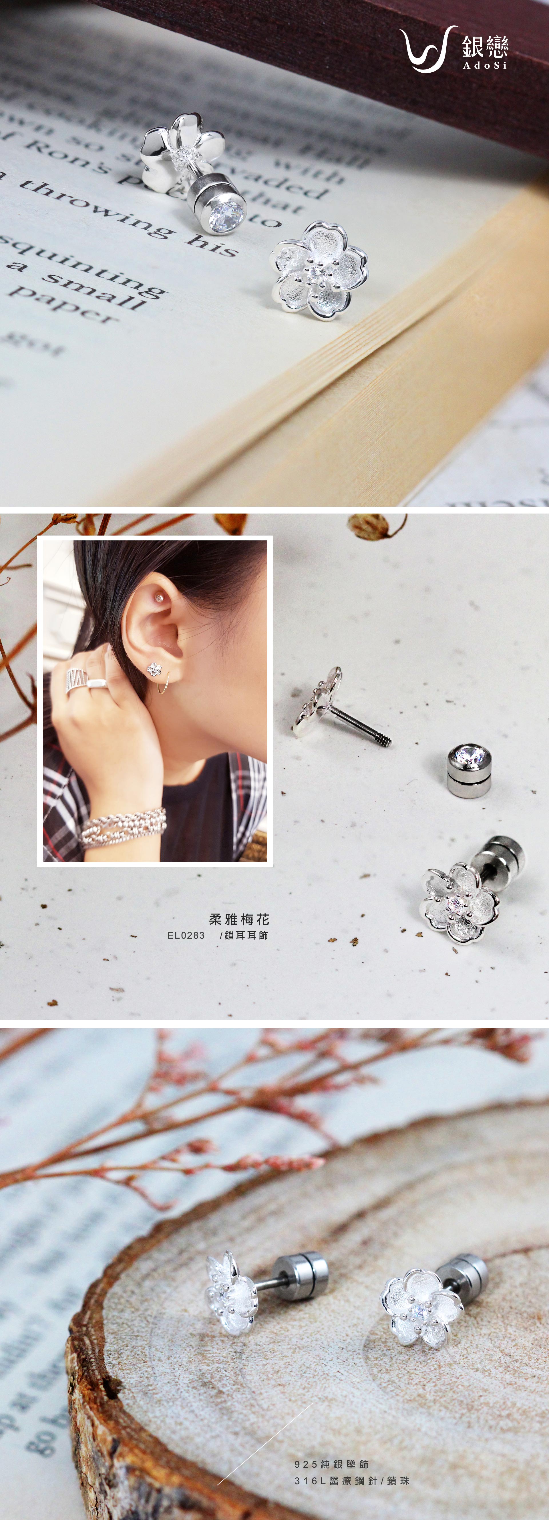 | 925純銀墜飾 | 梅花直徑7.8 mm 厚2.3 mm 針長4.5 mm 針粗0.8 mm 鎖珠直徑4mm | 耳環一對 |