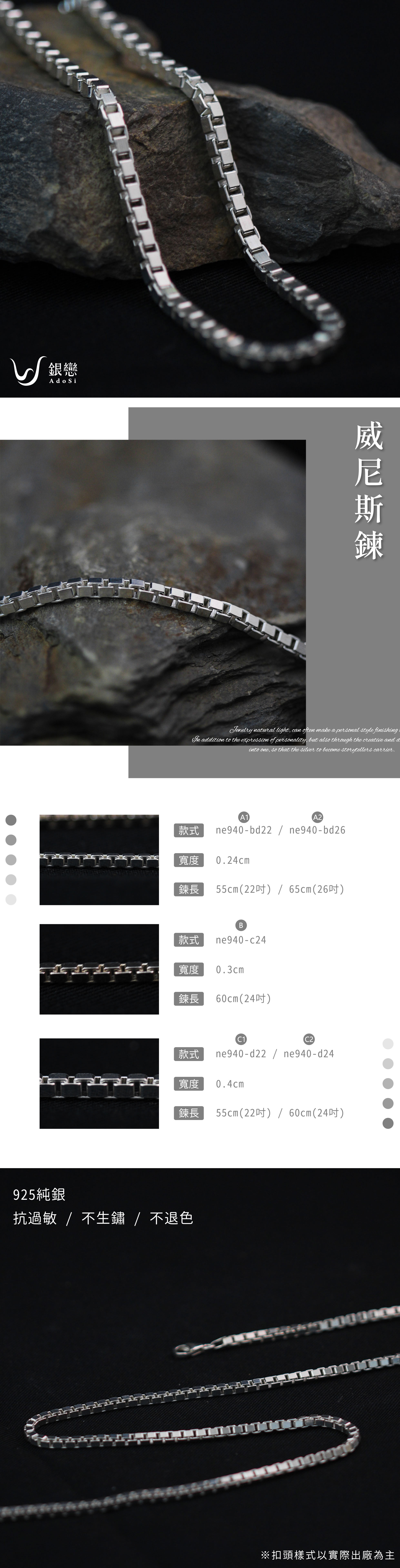 | 925純銀 | A1款 粗0.24 / 長 55 cm (22吋) A2款 粗0.24 / 長 65 cm (26吋) B款 粗0.3 / 長 60 cm (24吋) C1款 粗0.4 / 長 55 cm (22吋) C2款 粗0.4 / 長 60 cm (24吋)