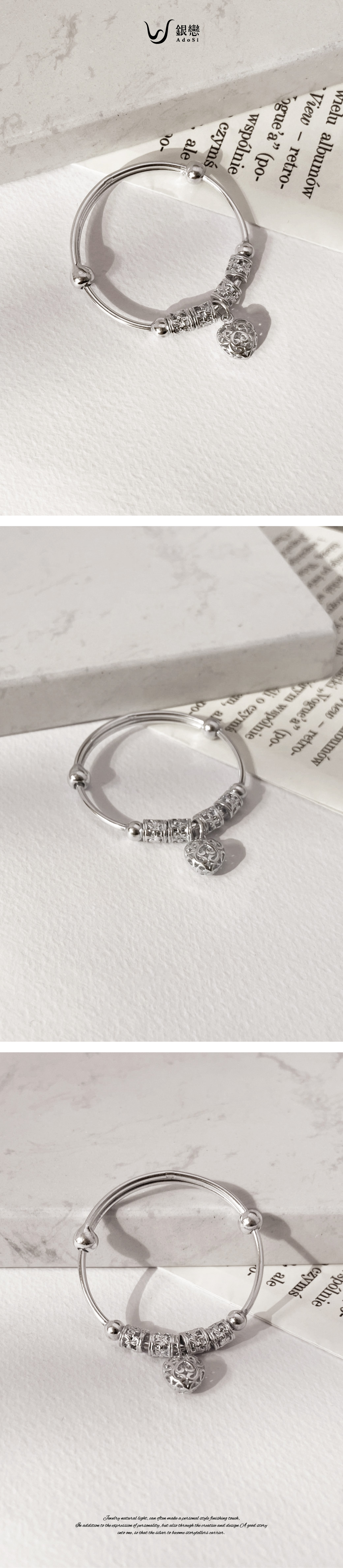 | 999足銀 | 寬0.2cm 內直徑4.2cm 愛心墜飾1X1cm | 手環1個 |